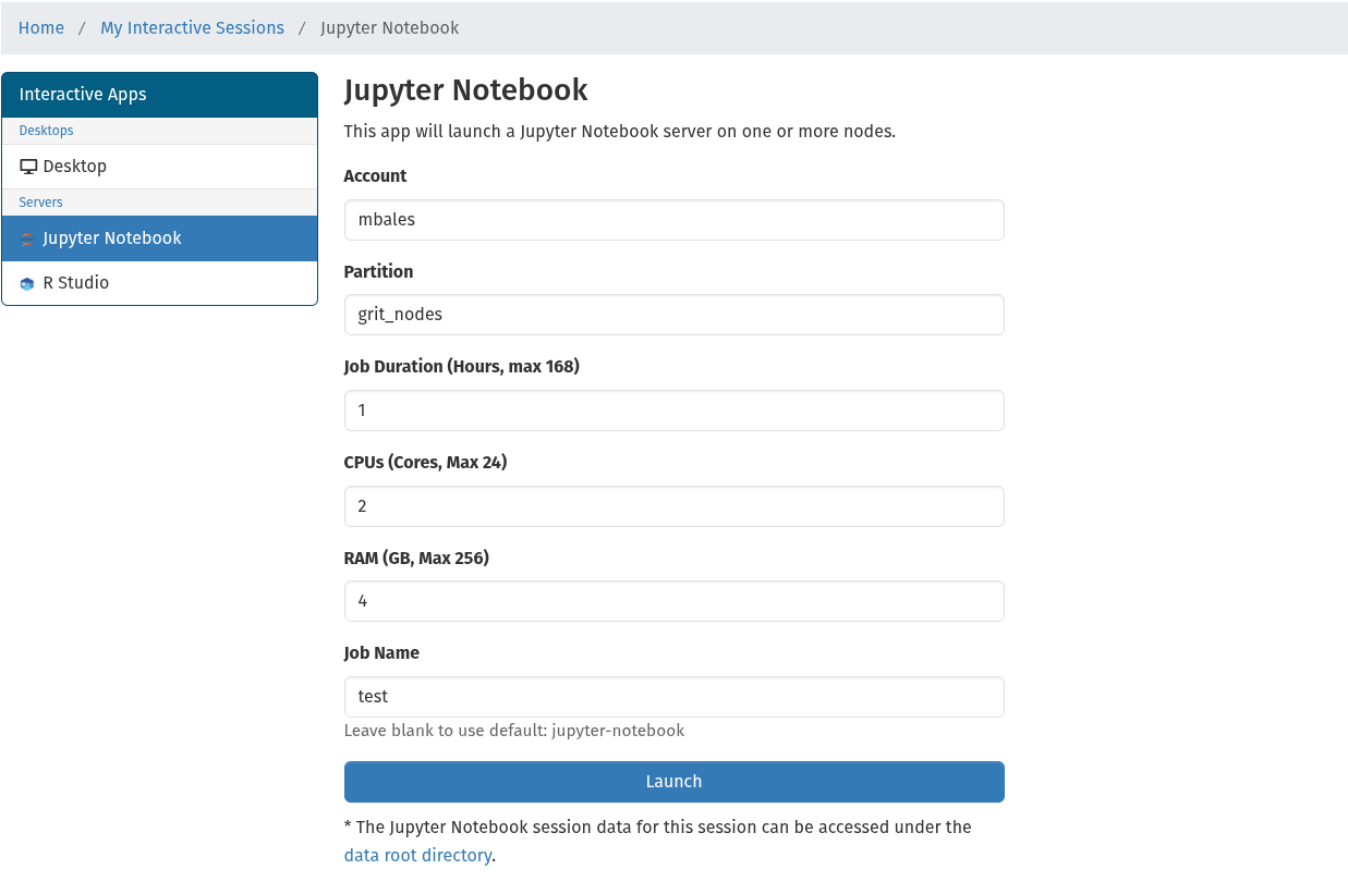 - Job Duration: set a number of hours for your Jupyter Notebook to run, after this expires your job will be stopped.